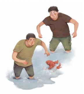 说什么就来什么,两人在逐鱼过程中,泥鳅眼冒金星,一下跌倒了,朝阴河口滑去。牛伢子此时已抓到了鱼,他一抬头,发现了正往阴河口滑去的泥鳅,当即将手中鱼放下。鱼连续几个翻滚,翻到流水里,随水掉到阴河里去了。虽然从此不见了天日,好歹保住了鱼命。