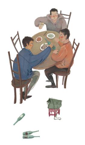 几个少年拼了一桌,大家一人拿了一罐啤酒开始叛逆,挑战禁忌。