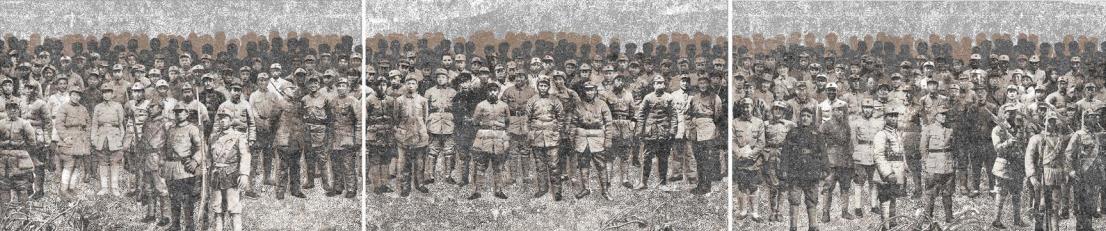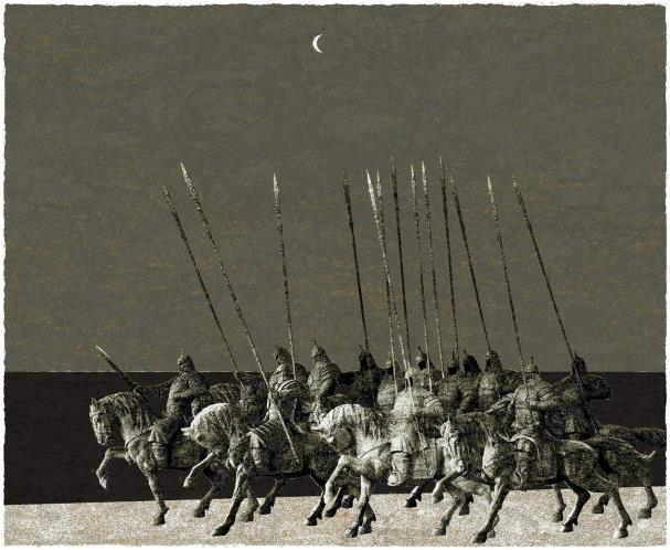 过程当中也有很多打磨,请了很多专家来提意见,最初的版本,画面里的士兵和天空是各占二分之一的,但是现在的这幅画里,旗帜和天空占到了画面的三分之二,天空中还有翱翔的雄鹰,这个改动主要是增加这幅画的写意性;前面加了一排俘虏,主要是增添了故事性。前期做了非常多的小稿子,试版,画面里的秦兵人物造型参照兵马俑的同时,也做了一些更符合现代审美的调整,比如他们的头身比,再比如车马的比例,跟兵马俑里铜车马的比例是不一样的。
