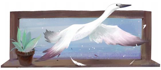 冰糖心奶奶回来时,冰糖心正站在窗边。“再见爸爸!再见爸爸!”她大声地喊着,然后回头对冰糖心奶奶说(当然,她听见奶奶的脚步了),“爸爸说他来年还会回来的!”她的声音已经像往日一样了,没有悲伤,听起来开心极了。她又转头喊了一句:“爸爸再见!”但窗外的那片天空里,已经看不见冰糖心的天鹅了。冰糖心抱着她的奶奶,奶奶正拿着一条热乎乎的毛巾,她抱着冰糖心,用那条热毛巾擦着自己皱巴巴的手背。
