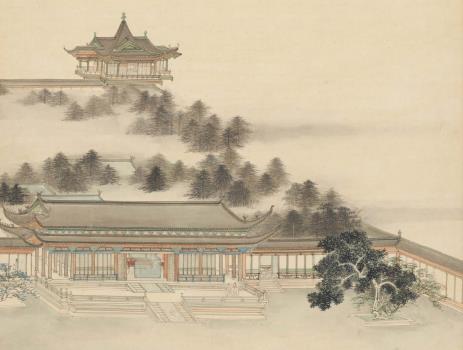 宫庭,金炉篆霭,烛光掩映。米大蜘蛛厮抱定,金盘种豆,花枝招飐银瓶。(老旦、贴)已到长生殿中,巧筵齐备,请娘娘拈香。(作将瓶花、化生盆设桌上,老旦捧香盒,旦拈香介)妾身杨玉环,虔爇心香,拜告双星,伏祈鉴佑。愿钗盒情缘长久订,(拜介)莫使做秋风扇冷。(生潜上窥介)觑娉婷,只见他拜倒在瑶阶暗祝声声。