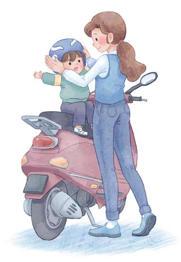 影,她戴着蓝色头盔,身穿蓝色小马甲。